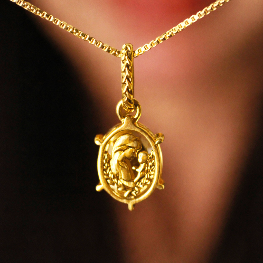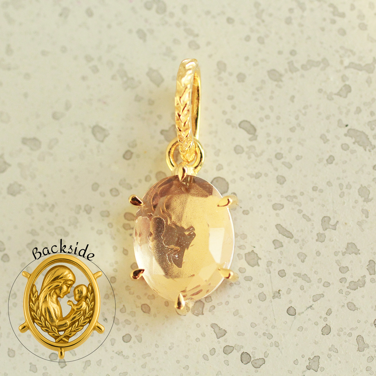 Een subtiele hanger van heldere kwarts waarin, bij goed kijken, het silhouet van een moeder met haar baby zichtbaar wordt. Van een afstand rustig en minimalistisch, met een persoonlijk detail voor wie het ziet.