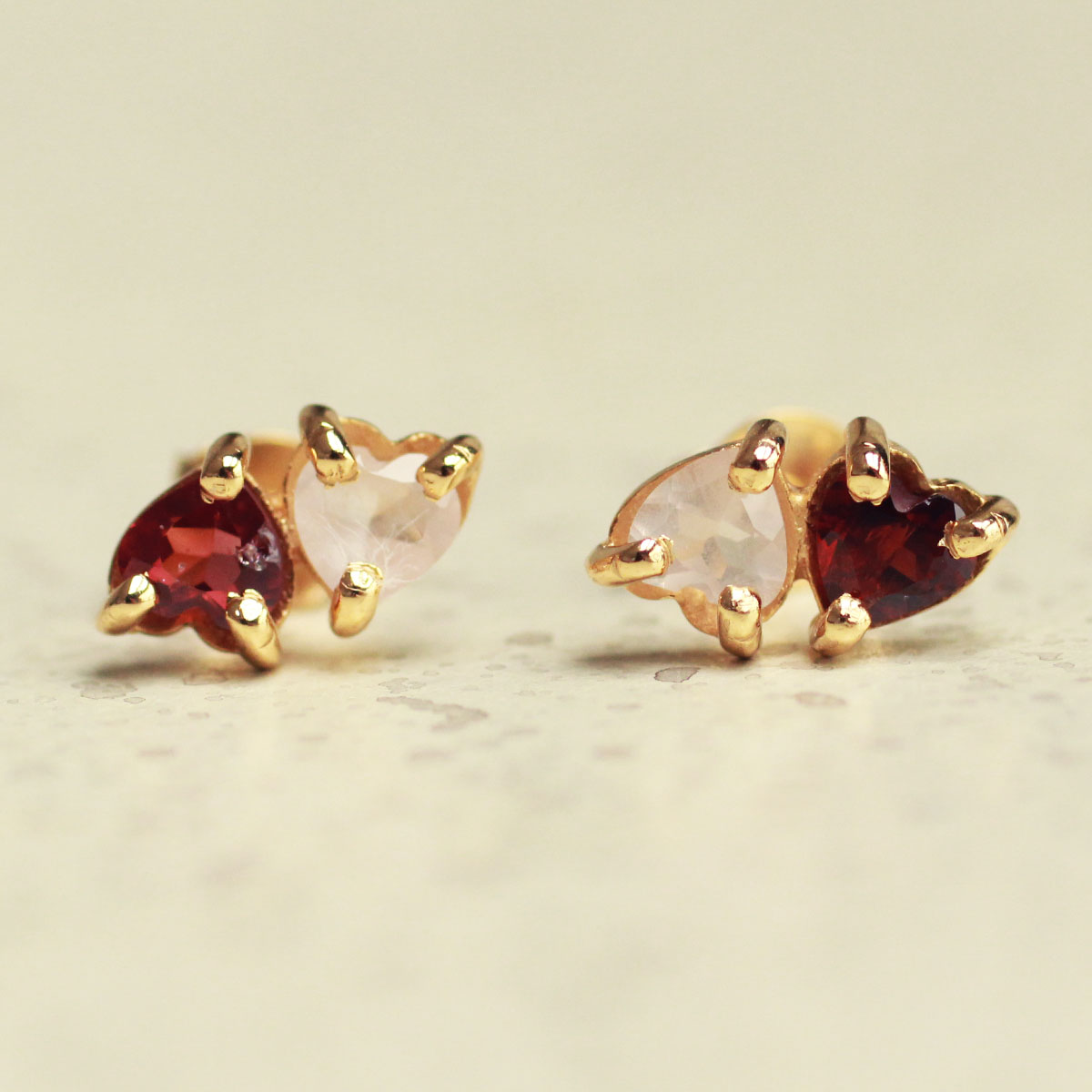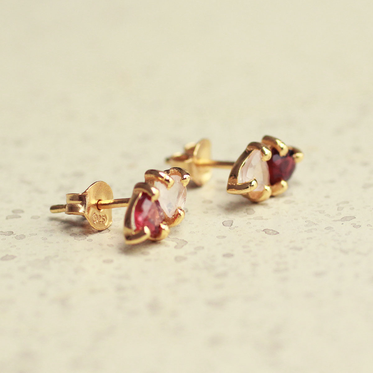 Handgemaakt 925 sterling zilver granaat en rozenkwarts harten oorknoppen goldplated.